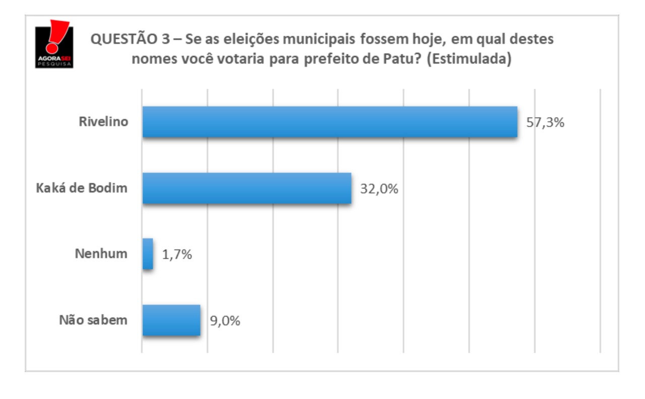 Pesquisa do Instituto Agora Sei realizada no município oestano de Patu, registrada sob o número RN-03138/2020, auferiu um quadro praticamente definido e muito difícil de se alterar. O atual prefeito Rivelino Câmara aparece na pesquisa com 57% de intenção de votos na estimulada, contra 32% da segunda colocada Kaká de Bodim, obtendo portanto uma diferença de 25 pontos percentuais, faltando apenas 4 dias pras eleições, e com apenas 9% de indecisos. Um outro dado que chamou a atenção foi, quando perguntados sobre quem acham que vai ganhar a eleição, 62% dos entrevistados responderam Rivelino, o que demonstra um alto índice de expectativa de vitória para o atual gestor.