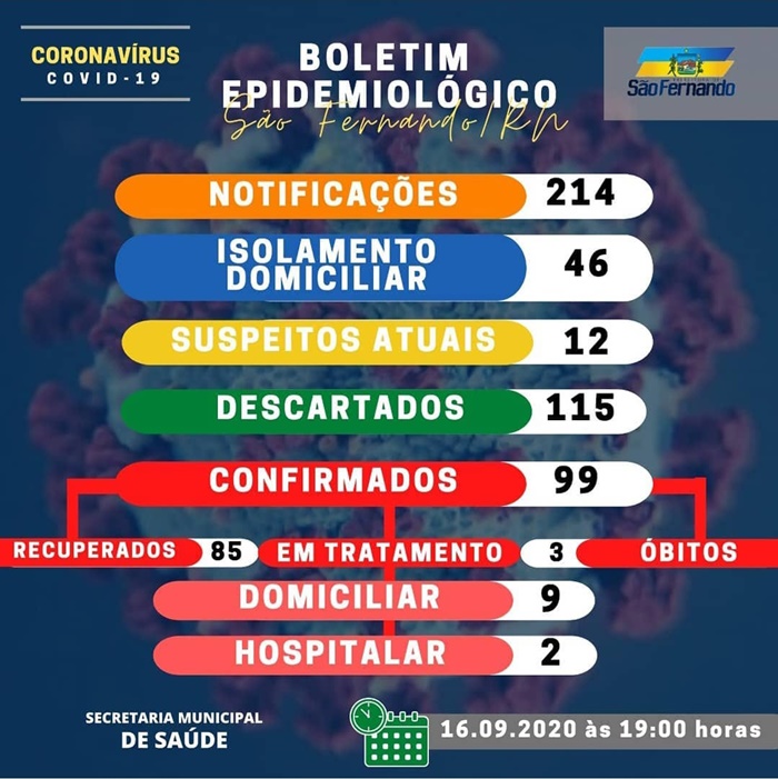 A cidade de São Fernando chegou hoje aos 99 casos confirmados do novo coronavírus. Lá também registou óbitos, foram 03 até a presenta data.
