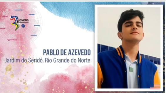 Pablo é estudante de Informática no IFRN de Parelhas e foi o único do Rio Grande do Norte a ser selecionado para a edição do evento em 2021. O programa acontecerá entre os dias 14 de junho e 13 de agosto deste ano, com Jovens Embaixadores, brasileiros e americanos, se juntando para participar de atividades e oficinas sobre liderança, cultura e comunicação, cidadania digital, mudança social em sua comunidade e em nível global e para compartilhar, sempre virtualmente, um pouco de sua história e cultura por meio de suas famílias e comunidades.