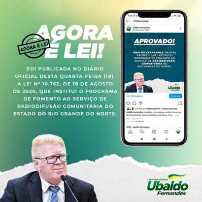 As rádios comunitárias do Rio Grande do Norte ganham novo fõlegp e incentivo com a instituição do Programa de Fomento ao Serviço de Radiodifusão Comunitária do Estado, pela Lei n° 10.762, de 18 de agosto de 2020, sancionada pela governadora Fátima Bezerra. Esta lei foi publicada hoje (19) no Diário Oficial do Estado e é de autoria do deputado Ubaldo Fernandes (PL).