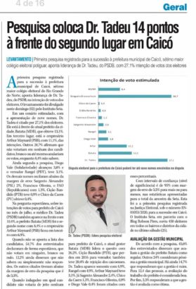 Em números objetivos a pesquisa apontou que Tadeu tem mais de 27% da intenção do eleitorado caicoense se as eleições fossem hoje.