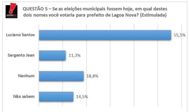 O levantamento do Instituto AGORASEI, em parceria com o blog Jair Sampaio, que entrevistou eleitores do município de Lagoa Nova sobre o pleito eleitoral de 2020 apontou que levando em consideração a disputa entre dois candidatos, Luciano Santos e Hélio Costa, o atual gestor leva a disputa com folga (ESTIMULADA). Veja os números:
