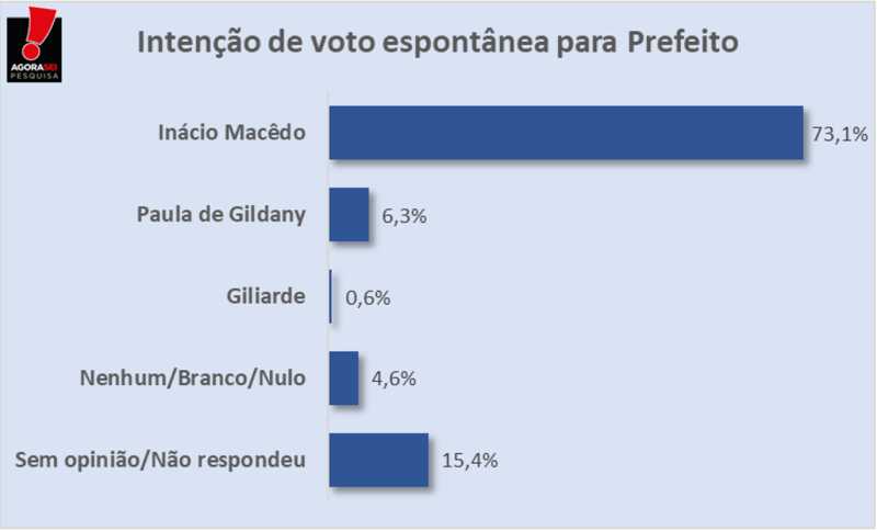 Pesquisa realizada pelo Instituto Agorasei, em Tenente Laurentino Cruz, revela que o atual prefeito, Inácio Macêdo, seria reeleito com folga. De acordo com os números da sondagem, 73,1% dos entrevistados afirmam que votariam nele na questão espontânea. Paula de Gildany é citada por apenas 6,3% e Giliarde por 0,6%.