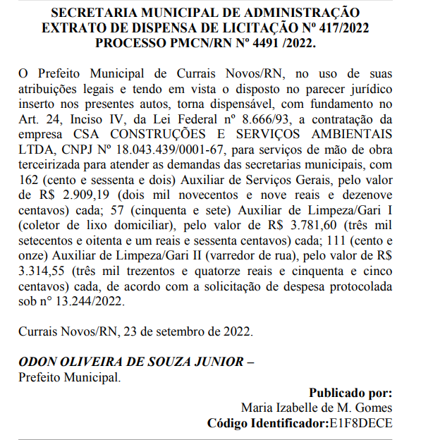 Foi publicado no Diário Oficial dessa segunda-feira (26), a contratação da empresa CSA CONSTRUÇÕES E SERVIÇOS AMBIENTAIS LTDA, CNPJ Nº 18.043.439/0001-67 pela Prefeitura para serviços de mão de obra terceirizada para atender as demandas das secretarias municipais, com 162 (cento e sessenta e dois) Auxiliar de Serviços Gerais, pelo valor de R$ 2.909,19 (dois mil novecentos e nove reais e dezenove centavos) cada; 57 (cinquenta e sete) Auxiliar de Limpeza/Gari I (coletor de lixo domiciliar), pelo valor de R$ 3.781,60 (três mil setecentos e oitenta e um reais e sessenta centavos) cada; 111 (cento e onze) Auxiliar de Limpeza/Gari II (varredor de rua), pelo valor de R$ 3.314,55 (três mil trezentos e quatorze reais e cinquenta e cinco centavos) cada.