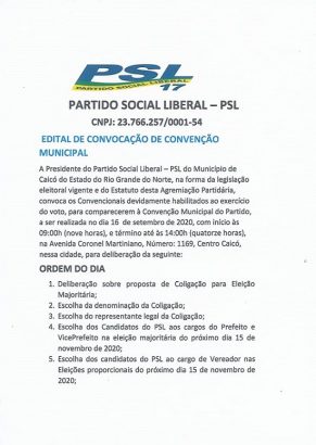 O PSL-CAICÓ, no uso das suas atribuições, retifica o dia da sua convenção, que estava marcada para o dia 15 de setembro. Informa aos convencionais que a nova data passará para o dia 16 de setembro, das 9h às 14h como previsto em edital de convocação de convenção.