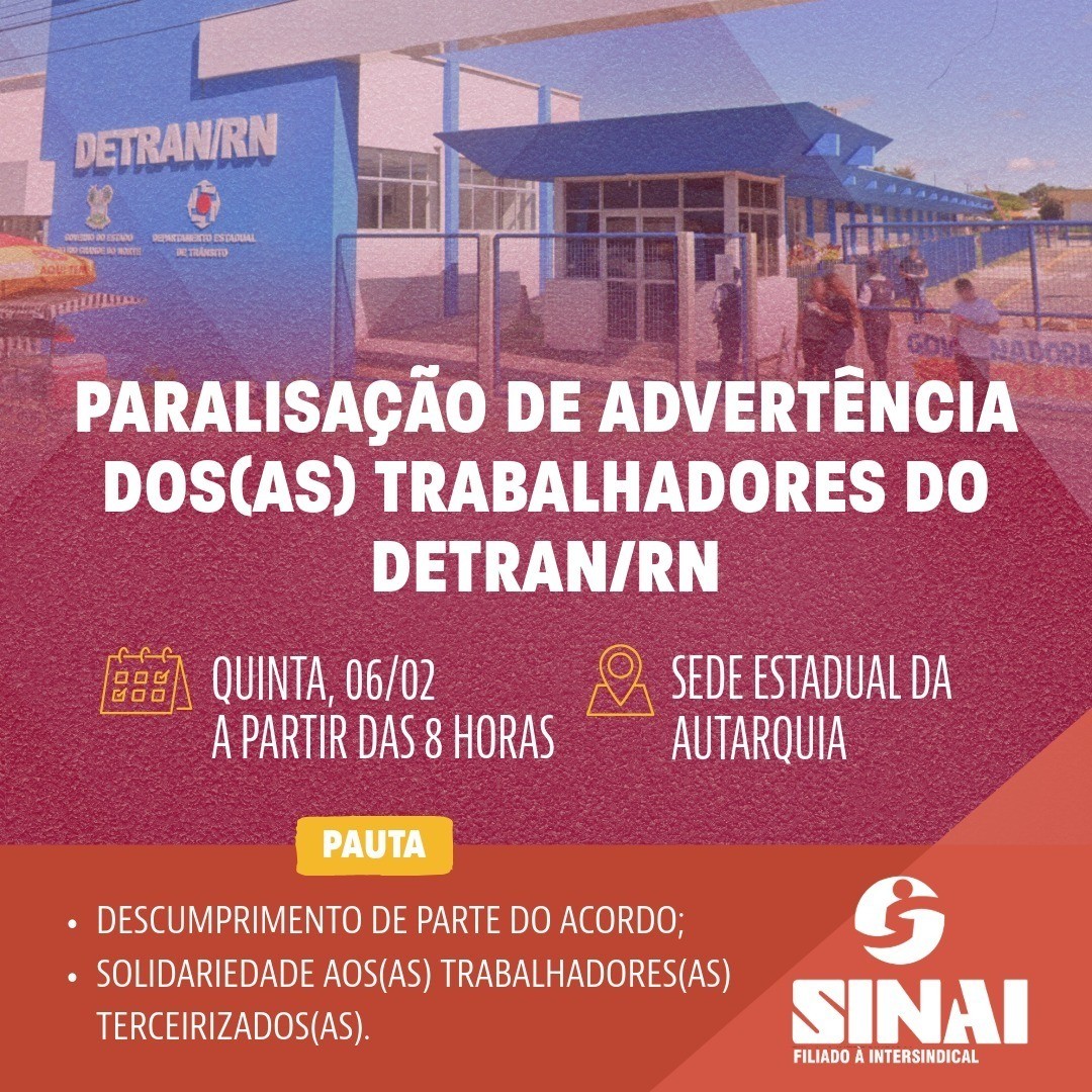 Trabalhadores do DETRAN do Rio Grande do Norte vão paralisar suas atividades durante 24 horas no dia 06 de fevereiro (quinta-feira). Deliberada em Assembleia virtual em 30 janeiro, será marcada por um Ato Público em frente à sede estadual da autarquia, em Natal, a partir das 8 horas. A atividade será organizada pelo Sindicato dos Servidores Públicos da Administração Indireta do Rio Grande do Norte (SINAI-RN).