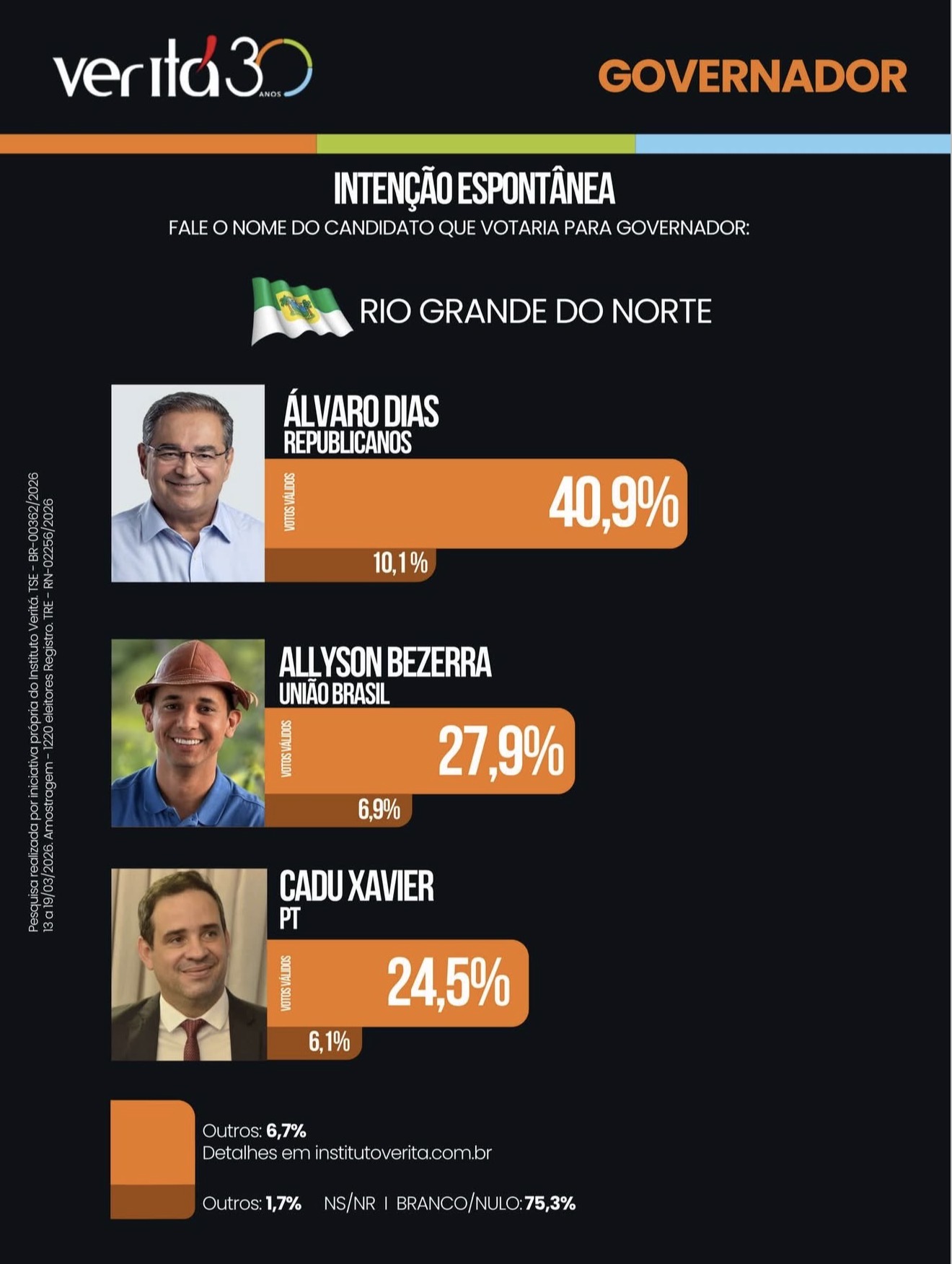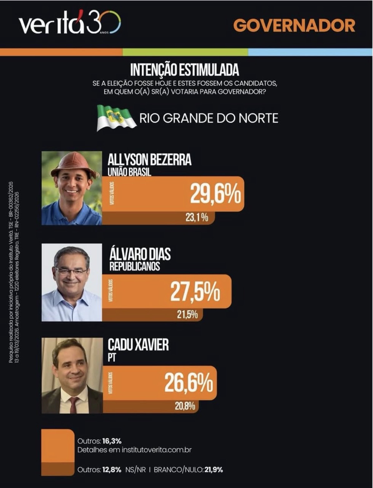 O levantamento foi realizado pelo Instituto Veritá, com 1.220 eleitores entrevistados em todo o Rio Grande do Norte, entre os dias 29 de março e 4 de abril de 2026. A pesquisa está registrada sob os números TRE-RN 02256/2026 e TSE BR-00362/2026, possui margem de erro de 3 pontos percentuais e foi realizada por iniciativa própria do instituto.