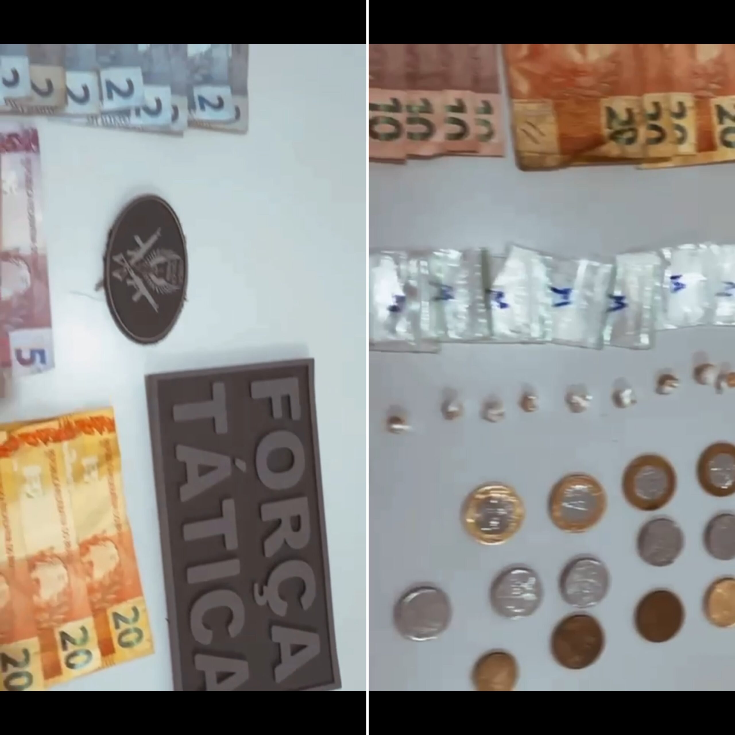 Na noite da última quarta-feira (02), por volta das 22h, equipes da Força Tática realizavam patrulhamento na região conhecida como “Mosquito”, área já monitorada por histórico de comercialização de entorpecentes, quando identificaram dois indivíduos em atitude suspeita. Durante a abordagem, os policiais apreenderam 13 pedras de substância análoga ao crack, oito porções de cocaína embaladas em ziplocks, R$ 247,60 em dinheiro fracionado e dois aparelhos celulares, cuja procedência será investigada.
