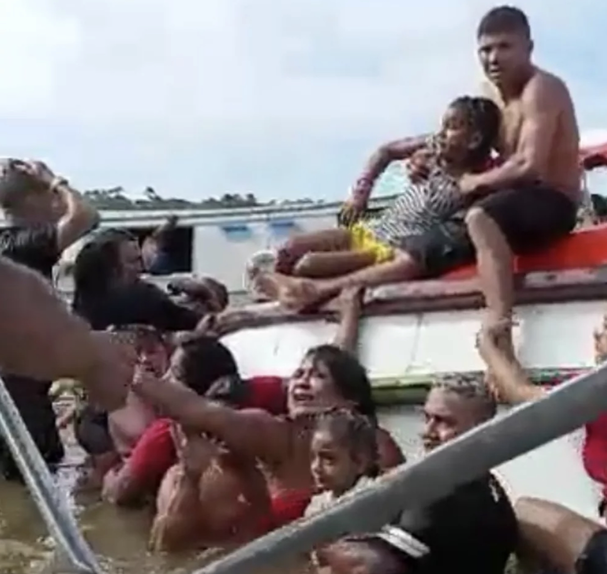 Vídeos que circulam nas redes sociais mostram os momentos de desespero. Nas imagens, embarcações menores tentam ajudar no resgate, enquanto pessoas pedem calma e gritam para salvar as crianças primeiro.