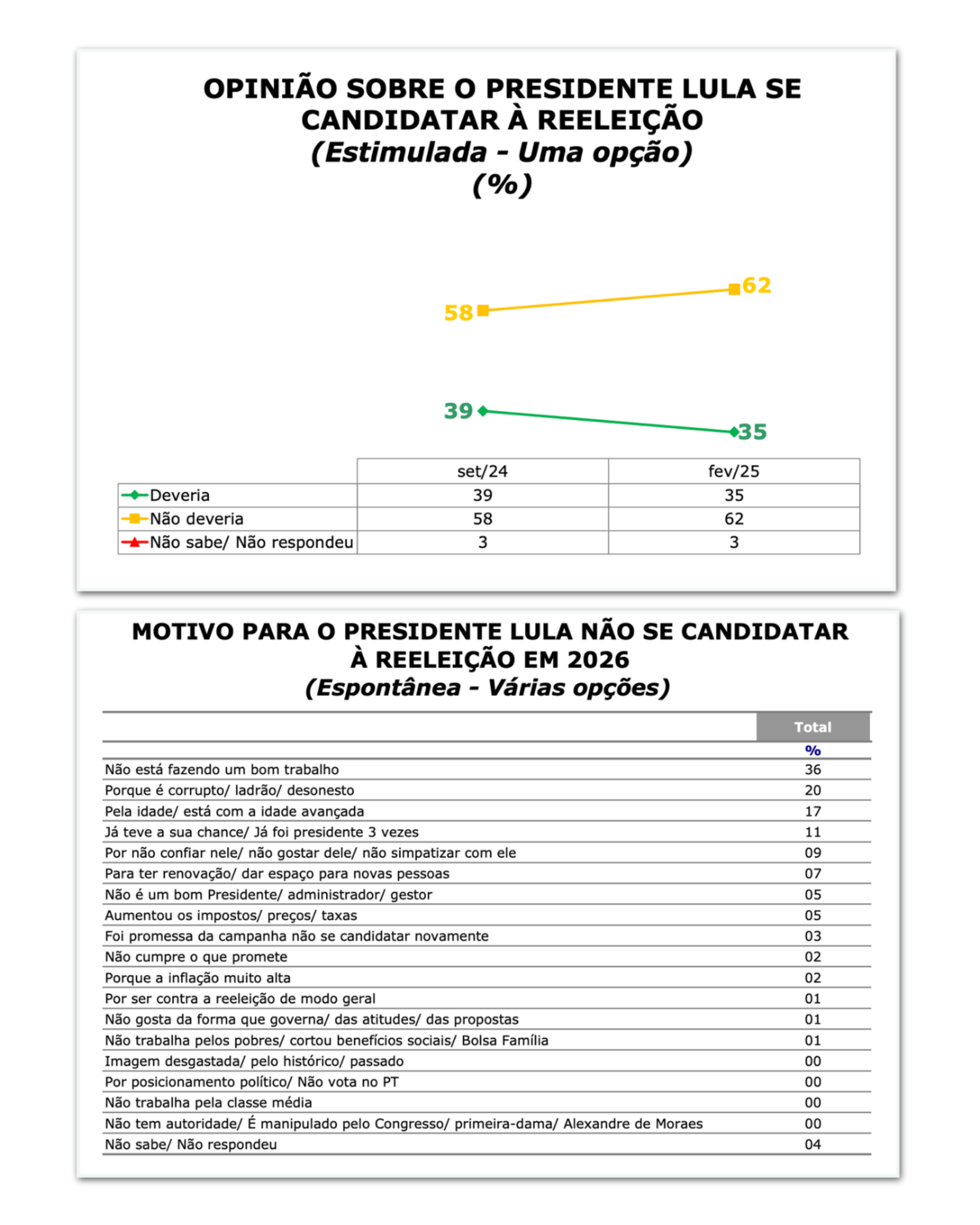 1 – Lula não deveria tentar a reeleição – 62% (eram 58% em novembro de 2024);