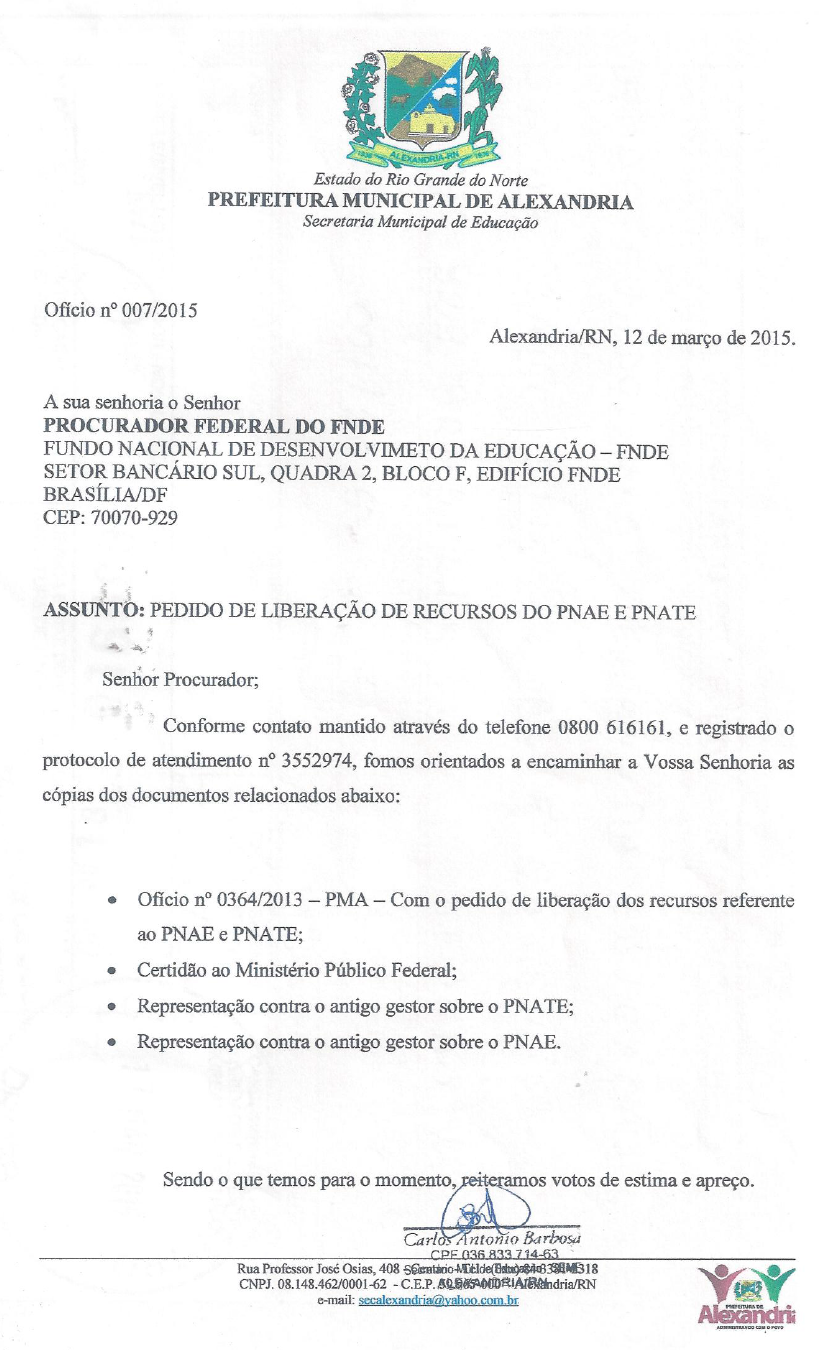 O Município de Alexandria teve, no mês de março do corrente ano, o bloqueio dos recursos provenientes do PNAE – Programa Nacional de Alimentação Escolar. O problema foi causado por falta de uma prestação de contas do ex – prefeito Alberto Patrício (PP), nos anos de 2011 e 2012.