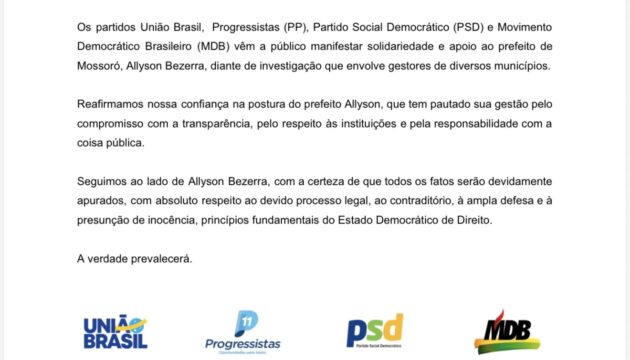 Os partidos União Brasil, Progressistas (PP), Partido Social Democrático (PSD) e Movimento Democrático Brasileiro (MDB) divulgaram, nesta semana, uma nota conjunta de apoio ao prefeito de Mossoró, Allyson Bezerra, em meio a uma investigação que envolve gestores de diversos municípios.