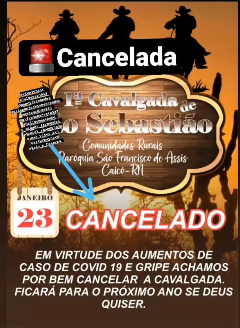 Outro evento já oficialmente cancelado é a cavalgada de São Sebastião, que ocorreria no próximo domingo em comemoração às festividades do santo, que tem sua capelinha no Complexo Ilha de Santana.