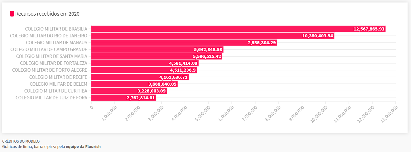 O valor, entretanto, pode não significar a totalidade dos recursos gastos com as instituições, porque os salários de professores militares podem vir de outras fontes orçamentárias que não permitem discriminação.