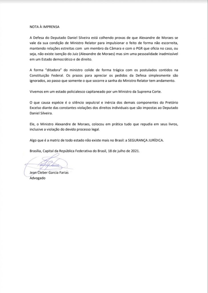 Em nota à imprensa, Jean Cleber Garcia Farias, advogado do deputado federal Daniel Silveira, desabafou sobre a maneira como o ministro do STF Alexandre de Moraes vem conduzindo o caso.