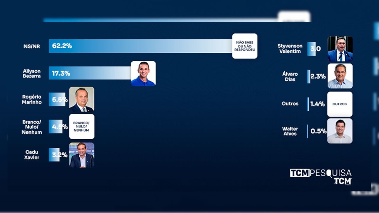 Na pesquisa espontânea, onde o eleitor responde livremente, 62,2% disseram não saber ou não responderam. Allyson lidera com 17,3%, seguido de Rogério Marinho (5,5%), Cadu Xavier (3,2%), Styvenson Valentim (3,0%), Álvaro Dias (2,3%), e Walter Alves (0,5%). Brancos, nulos ou nenhum somaram 4,5%, e outros nomes, 1,4%.