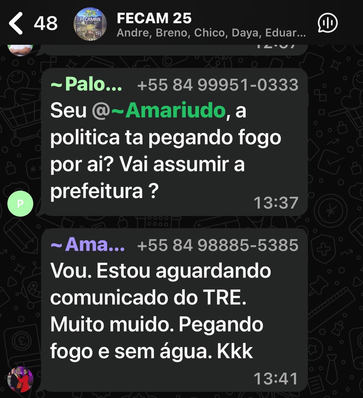 O presidente da Câmara Municipal, vereador Amariudo dos Santos (PP) admitiu hoje no grupo de whatsapp da Federação das Câmaras Municipais do Rio Grande do Norte (Fecam/RN), que só aguarda a intimação da justiça para assumir a cadeira. Nas próximas horas, a justiça deve oficializar. Os documentos já foram encaminhados no e-mail do Poder Legislativo e nos contatos pessoais do presidente da Câmara. Samuel Souto passou os últimos dias, após ser cassado, despachando na Prefeitura, inclusive fora do expediente, com a porta fechada. Samuel tentará se segurar na cadeira, mas sabe que a cada minuto o tempo é contra ele.