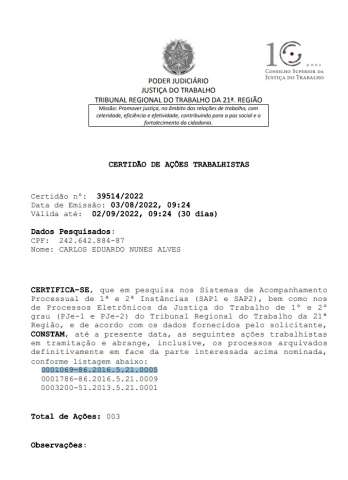 Fui em busca da certidão negativa de Carlos Eduardo na Justiça do Trabalho, constam 3 ações. Carlos Eduardo também é sócio de 4 empresas, sei que não administra nenhuma, há mais de 4 anos não exerce nenhuma atividade laboral, porém como sócio tem os benefícios gerados pelas empresas, financeiros e políticos. Assim, nos 4 CNPJ vinculados ao seu CPF constam 83 processos.
