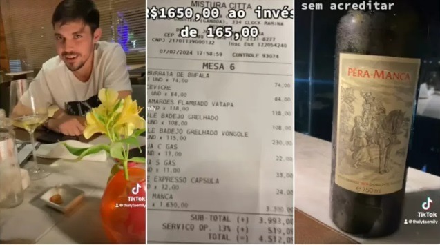 “Foi a minha amiga que olhou o cardápio. Ela falou ‘gente, achei um vinho de R$ 165. Vamos nesse, porque é o mais barato”. Até porque a gente tem uma regra. A gente sempre escolhe o vinho mais barato para economizarmos na conta. E foi isso. A gente teve essa surpresa no final bem desesperadora. A gente ficou nervoso. A gente se olhou. ‘Gente, não é possível, trouxeram a conta errada. Não tem cabimento’.