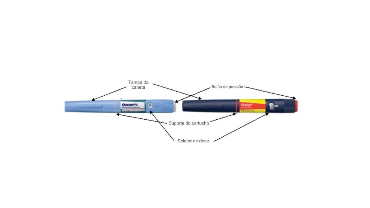 - A caneta de Ozempic® é de cor azul clara, com o botão de aplicação cinza. Já canetas de insulina Fiasp® são de cor azul escura, com botão laranja.