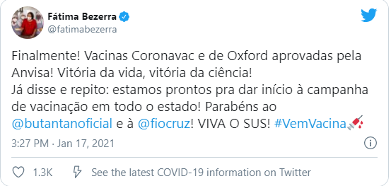 Após a autorização de uso emergencial das vacinas Coronavac e da Universidade de Oxford contra a Covid-19, a governadora do Rio Grande do Norte, Fátima Bezerra (PT), disse nas redes sociais que o estado está preparado para a vacinação. “Finalmente! Vacinas Coronavac e de Oxford aprovadas pela Anvisa! Vitória da vida, vitória da ciência! Já disse e repito: estamos prontos pra dar início à campanha de vacinação em todo o estado!”.(Veja abaixo)