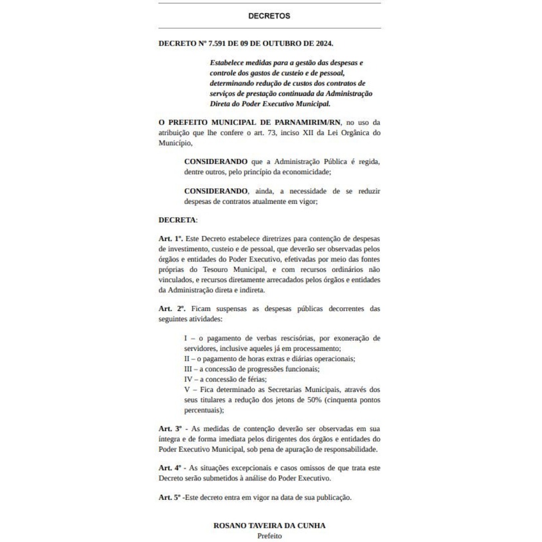 O prefeito de Parnamirim, Rosano Taveira (Republicanos), determinou um arrocho nas finanças do Município para a reta final de sua administração. Em decreto publicado nesta quinta-feira (10) no Diário Oficial, o prefeito manda suspender uma série de despesas com pessoal, com o objetivo de “controlar gastos”.