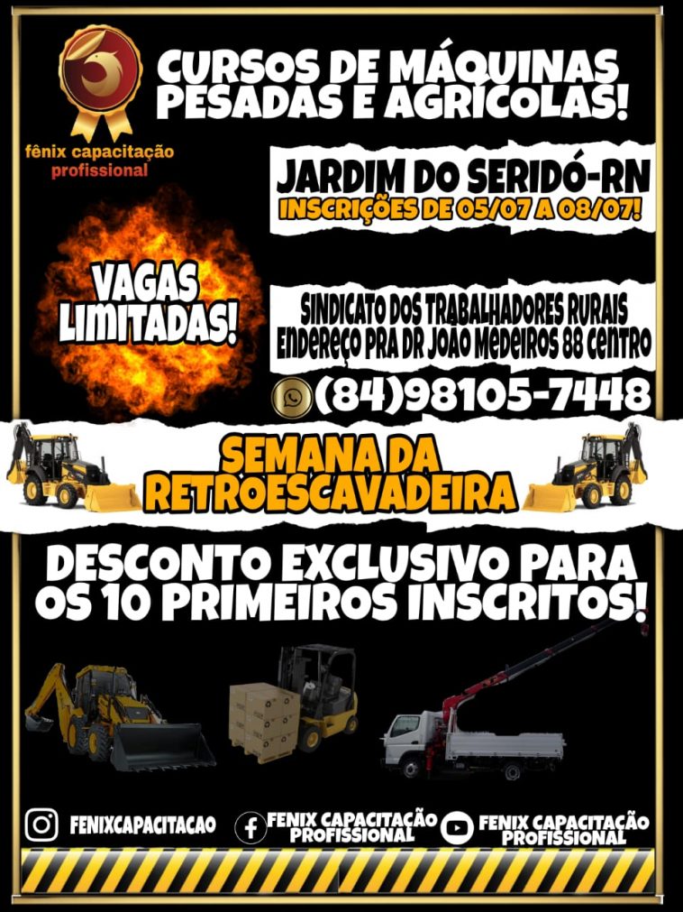 A empresa FÊNIX CAPACITAÇÃO PROFISSIONAL, de Macaíba, estará em Caicó para formar nova turma de operadores de máquinas pesadas. Com o sucesso da primeira turma, muitos jovens ficaram fora do curso por falta de vagas.
