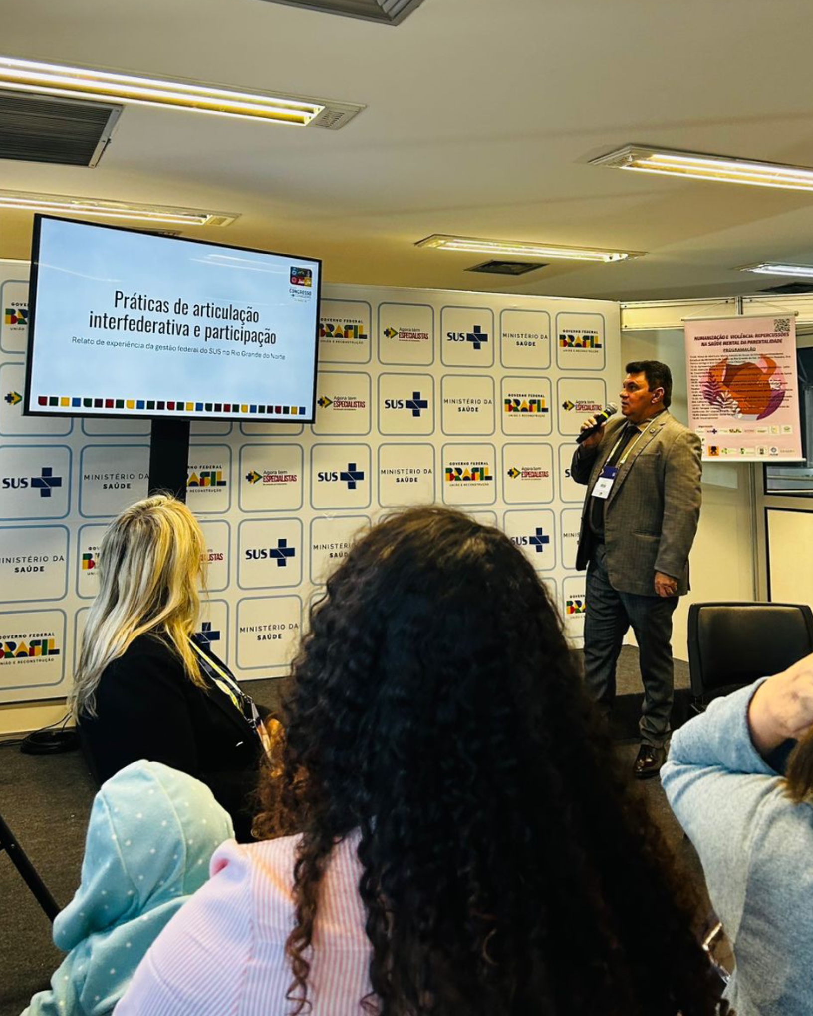 A exposição destacou estratégias inovadoras de integração interfederativa, com foco no fortalecimento do SUS e na pactuação entre entes federados.