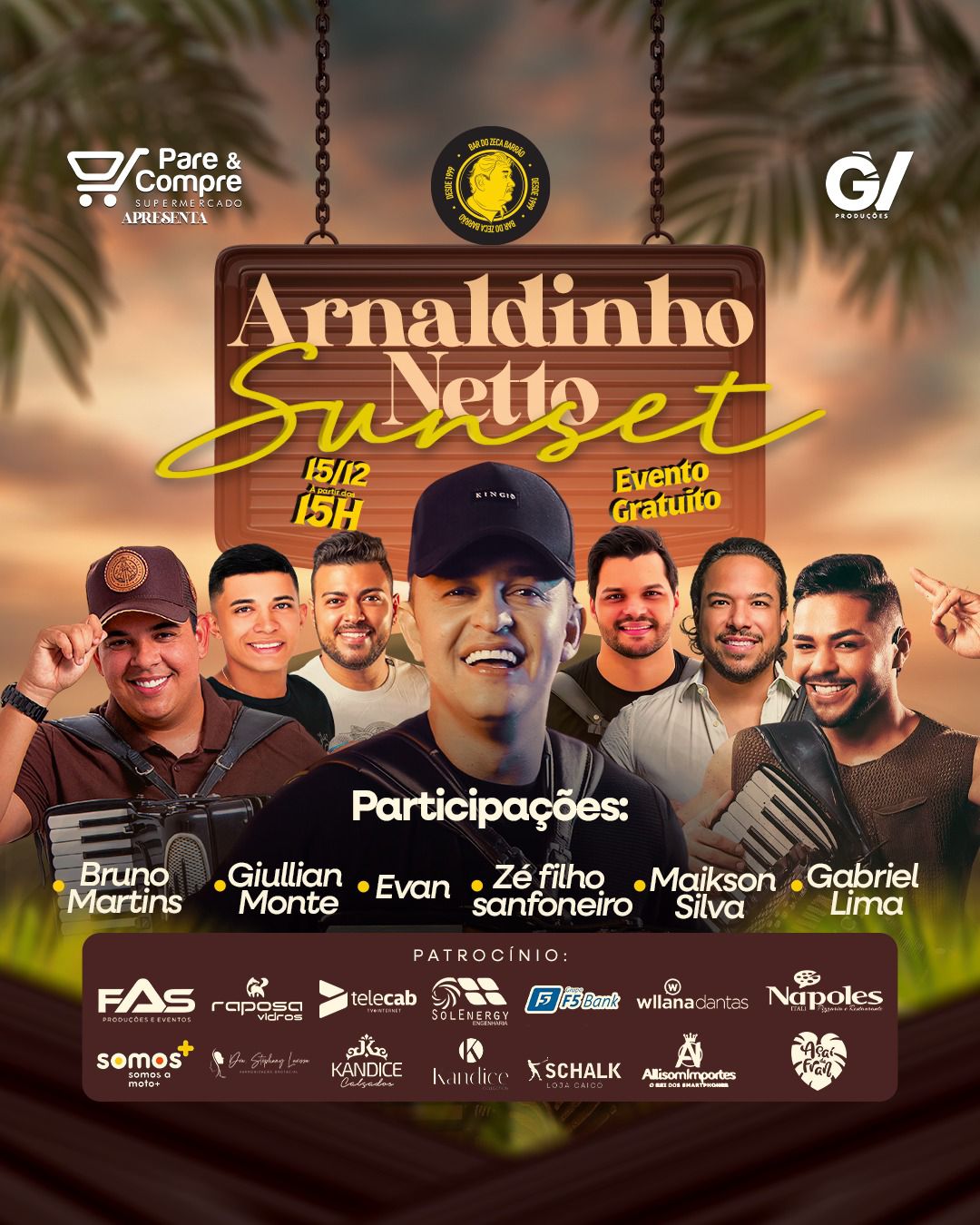 O evento, que faz parte do projeto Sunset, está programado para este domingo(15) com início às 15h, e promete reunir uma verdadeira constelação de talentos regionais. Além de Arnaldinho Neto, a festa contará com a animação de grandes nomes como Bruno Martins, Evan, Giulian Monte, Zé Filho Sanfoneiro, Maikson e Gabriel Lima, compondo uma programação variada e vibrante que agradará a todos os gostos.