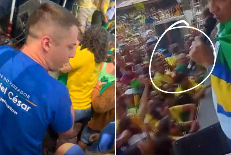 Apesar do pequeno público no comício de Salatiel de Souza, que recebeu o “Ex mais amado do Brasil”, ontem em Parnamirim, houve registro de tumultos devido às várias tentativas de aproximação das pessoas a Jair Bolsonaro, no entanto um caso mais sério, e até merece ser investigado, aconteceu na frente do palco do evento.