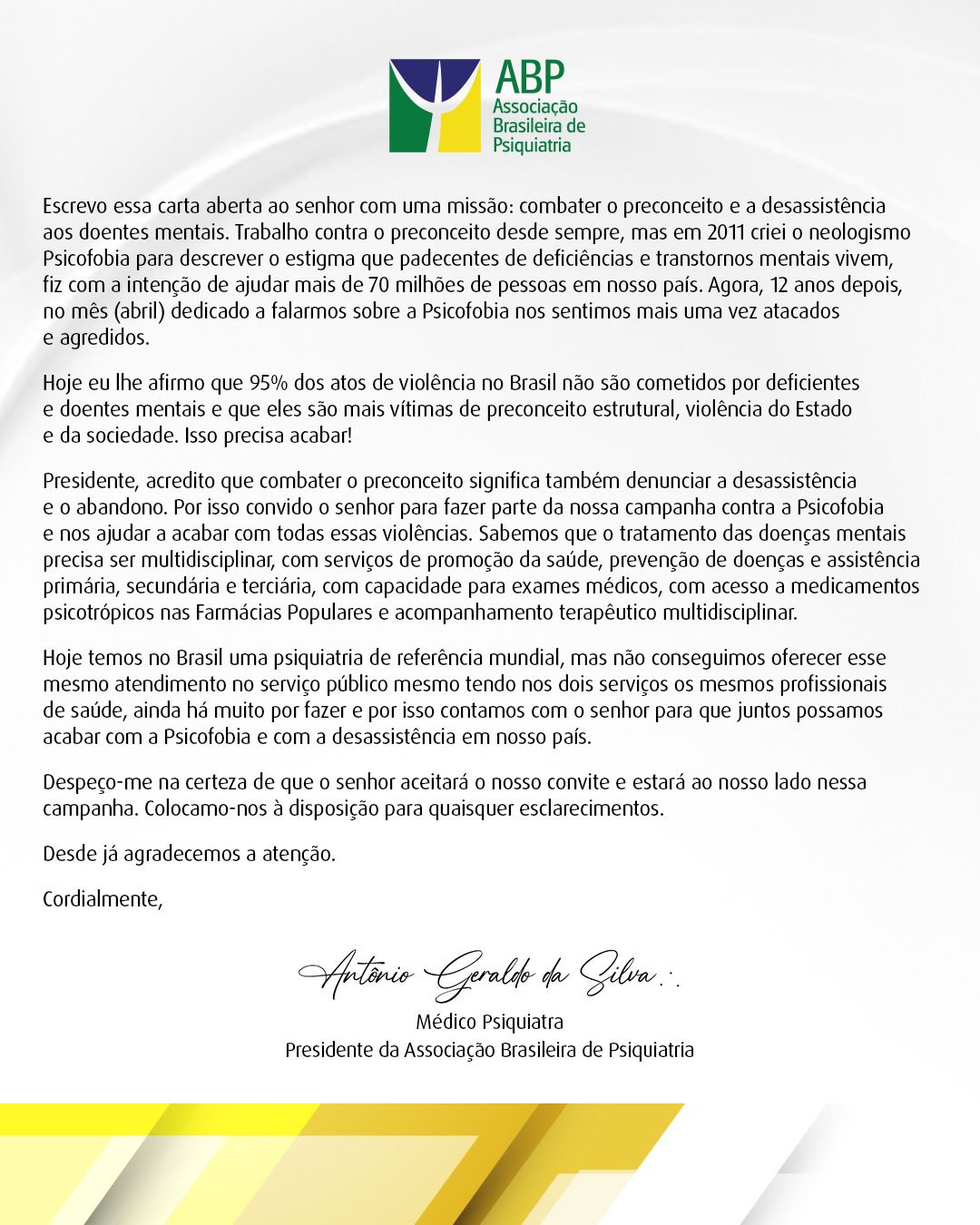 O presidente da ABP, Antônio Geraldo da Silva, emitiu uma carta aberta ao Presidente Luiz Inácio Lula da Silva e, de forma contundente, combateu o preconceito e a desassistência aos doentes mentais.