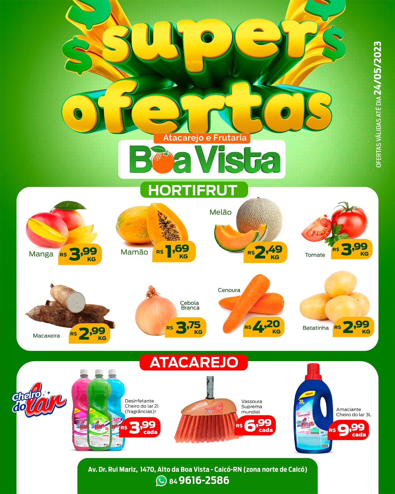 A partir das 7 horas da manhã, o Atacarejo e Frutaria Boa Vista já estará de portas abertas com o melhor em frutas, verduras, frios, materiais de limpeza, utensílios domésticos e muito mais!