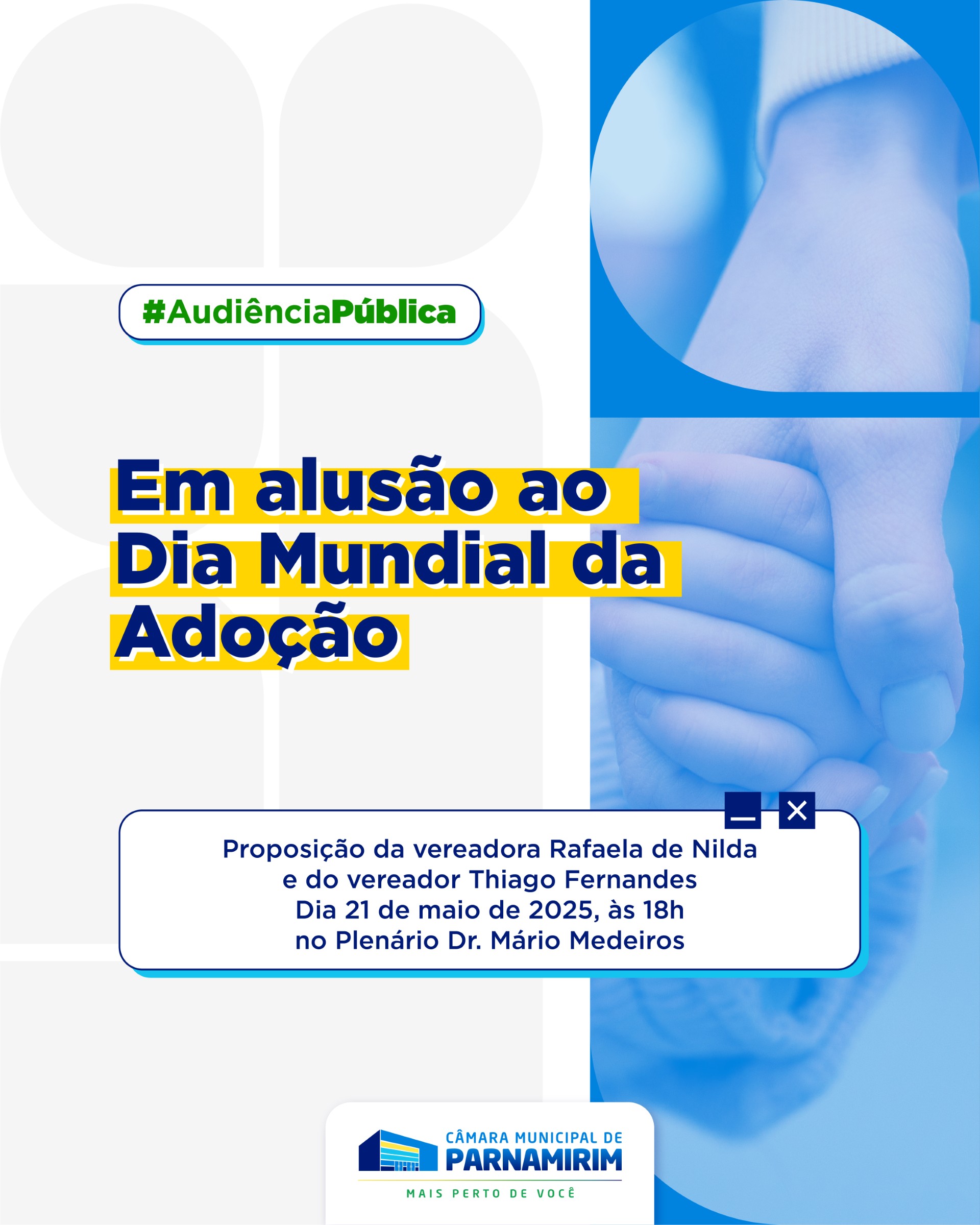 Nesta quarta-feira (21), a Câmara de Parnamirim realizará uma audiência pública para debater a temática do Dia Municipal da Adoção. O evento é uma proposição da vereadora Rafaela de Nilda e do vereador Thiago Fernandes.