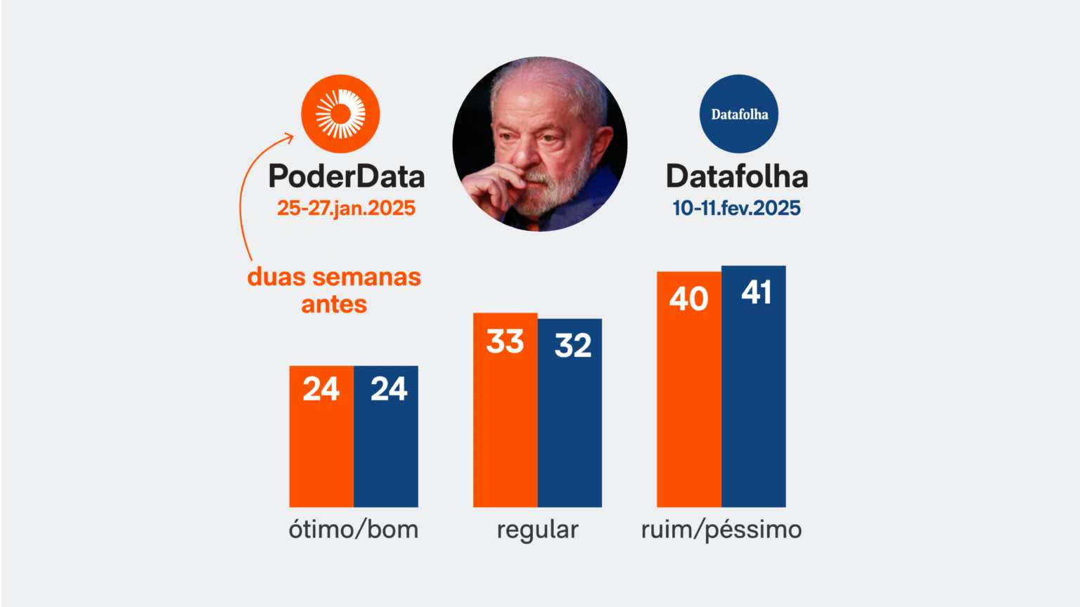 Compare os resultados sobre a avaliação do governo: ruim/péssimo – 40% (PoderData) X 41% (Datafolha); regular – 33% (PoderData) X 32% (Datafolha); ótimo/bom – 24% (PoderData) X 24% (Datafolha); não sabem – 3% (PoderData) X 2% (Datafolha).