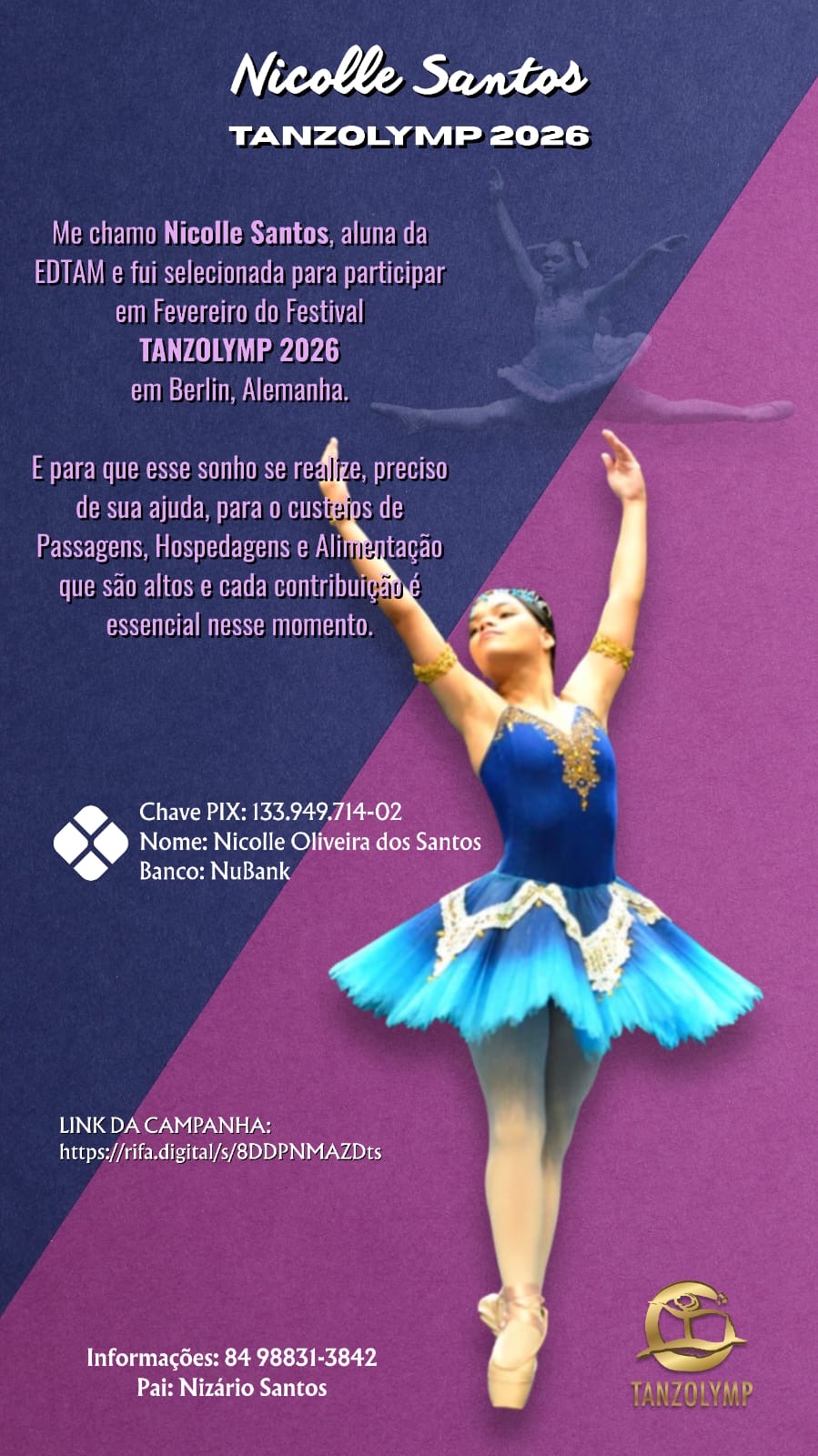 A jovem bailarina Nicolle Santos, aluna da EDTAM – Escola de Dança do Teatro Alberto Maranhão, em Natal (RN), foi selecionada para participar do TANZOLYMP 2026, um dos maiores festivais internacionais de dança do mundo, realizado em Berlim, na Alemanha. O evento, marcado para fevereiro de 2026, reúne talentos de diversos países e se tornou referência no aprimoramento artístico e na troca cultural entre jovens bailarinos.