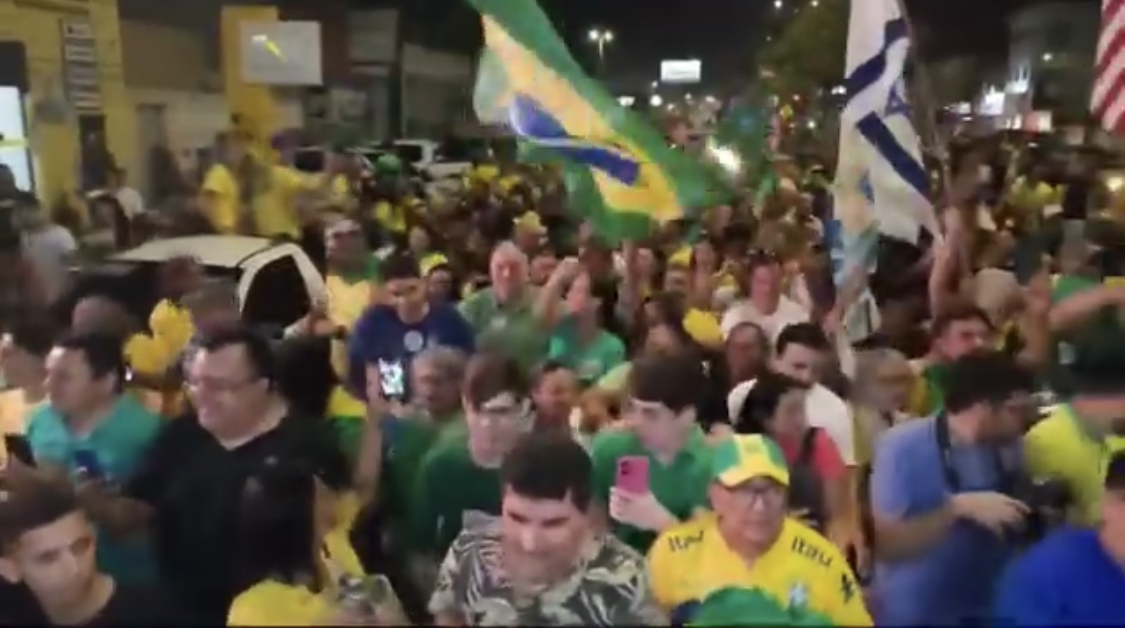 Vestidos de verde e amarelo, os simpatizantes carregavam bandeiras do Brasil, de Israel e dos Estados Unidos.