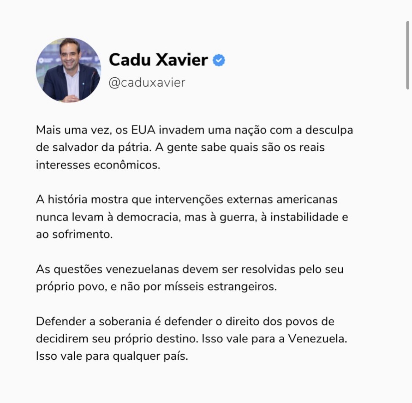 A declaração também projeta Cadu Xavier no debate político nacional, alinhando seu discurso ao do PT em defesa da autodeterminação dos povos e à crítica ao intervencionismo internacional, temas recorrentes em agendas progressistas no Brasil e no exterior.