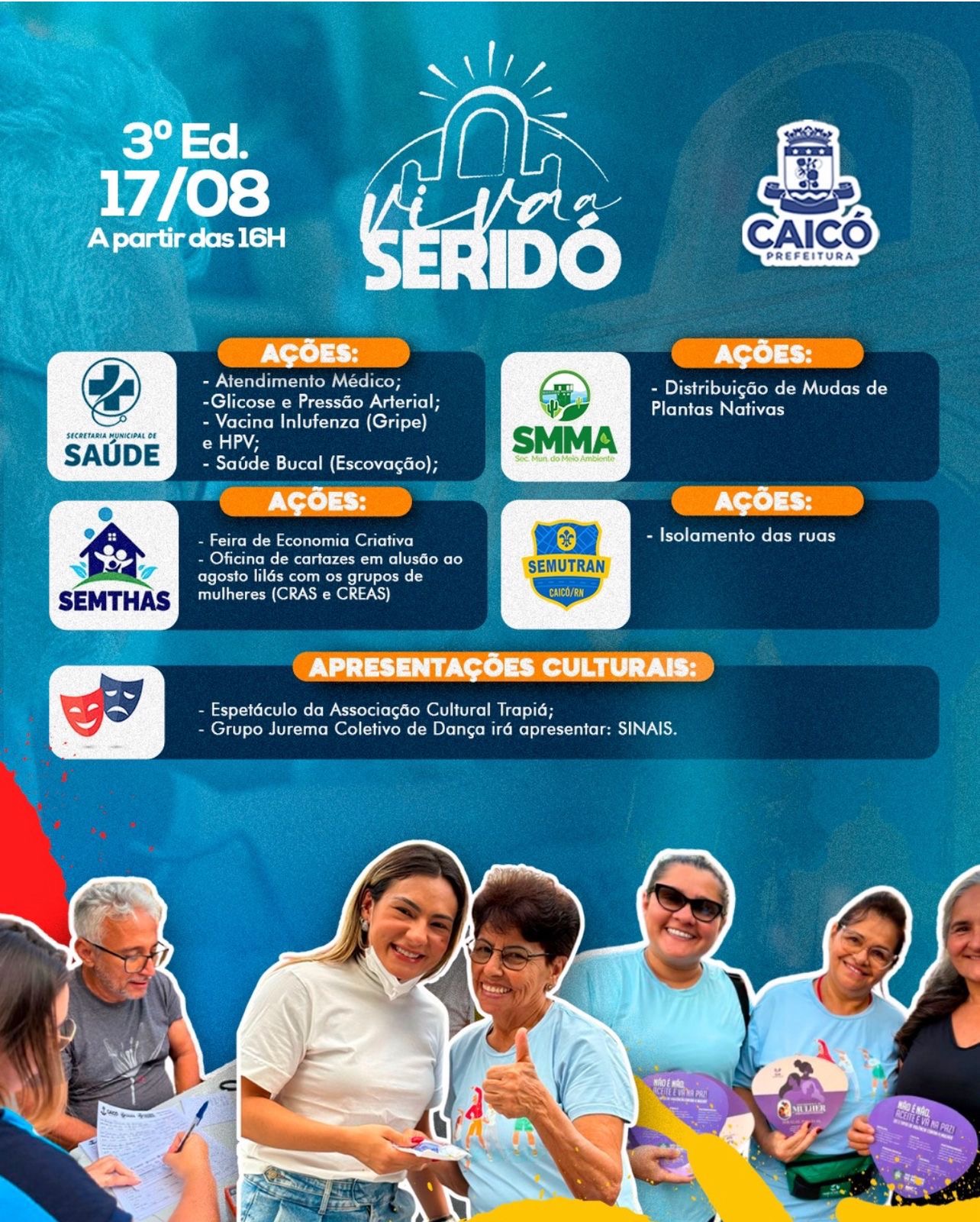 A Prefeitura de Caicó promove, neste domingo (17), a 3ª edição do Viva a Seridó, a partir das 16h, na Avenida Seridó, nas proximidades da Praça do Coreto.