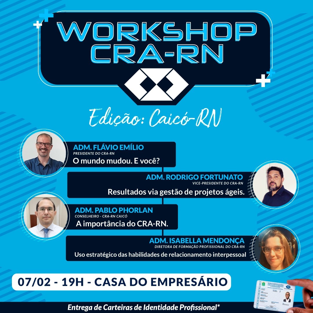 A programação inclui palestras com o presidente do CRA-RN, Adm. Flávio Emílio Cavalcanti; o vice-presidente, Adm. Rodrigo Fortunato; a Diretora de Formação Profissional, Isabella Mendonça e o conselheiro, Pablo Phorlan.