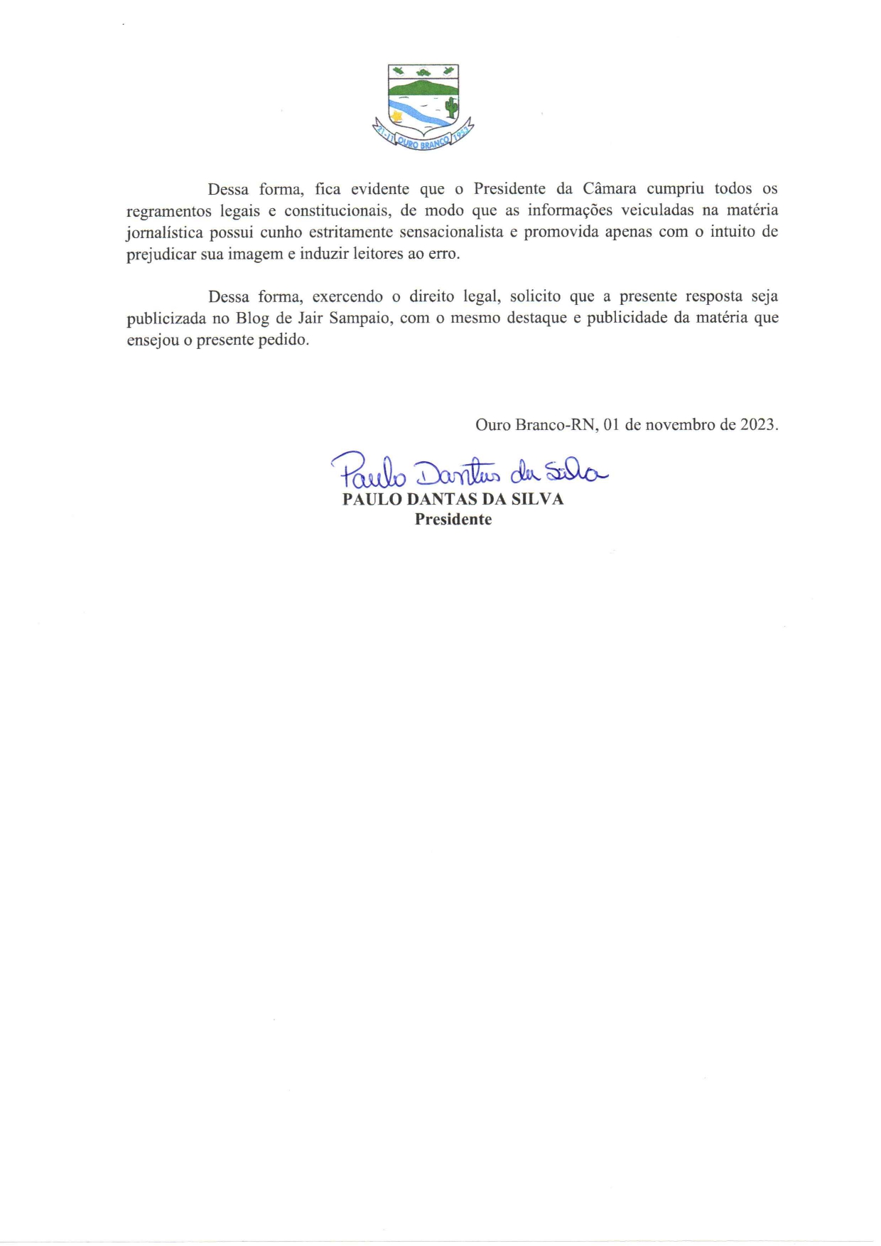 Em resposta à matéria do blog Jair Sampaio com o título: “Presidente da Câmara de Ouro Branco indefere emenda que ajudaria guardas municipais, motoristas e conselheiros tutelares“, Paulo Dantas disse que são informações não-condizentes com a realidade da casa.