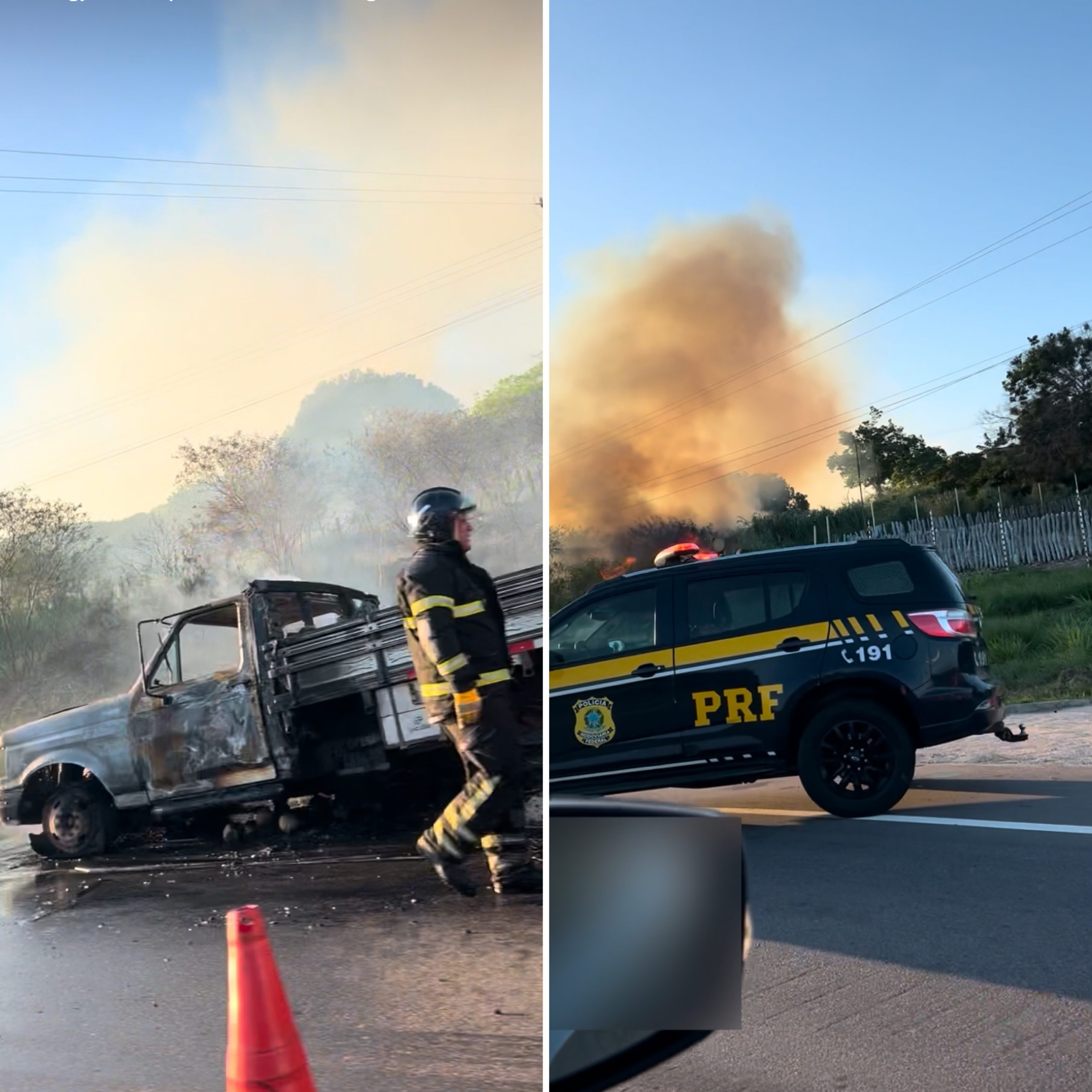 O Corpo de Bombeiros debelou as chamas do caminhão, contudo o fogo já havia se espalhado no mato à margem da rodovia.