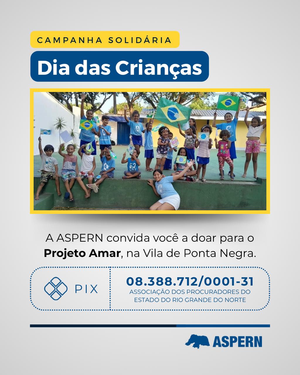 Neste mês de outubro, em que se comemora o Dia das Crianças, a Associação dos Procuradores do Estado do RN (ASPERN) iniciou mais uma campanha em apoio às crianças atendidas pelo Amar Antes Projeto. A campanha tem a finalidade de arrecadar itens essenciais novos, como roupas íntimas infantis (2 a 6 anos), produtos de higiene pessoal e toalhas de banho, e ainda doações financeiras.
