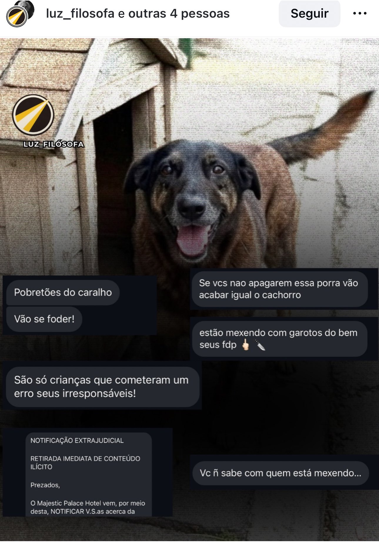 A investigação sobre a agressão ao animal é feita pela Delegacia de Atendimento ao Adolescente em Conflito com a Lei da Capital (Deacle). Já o inquérito policial que resultou no indiciamento dos familiares foi feito pela Delegacia de Proteção Animal da Capital (DPA). Os parentes, que foram identificados apenas como um advogado e dois empresários, teriam tentado coagir testemunhas do caso.