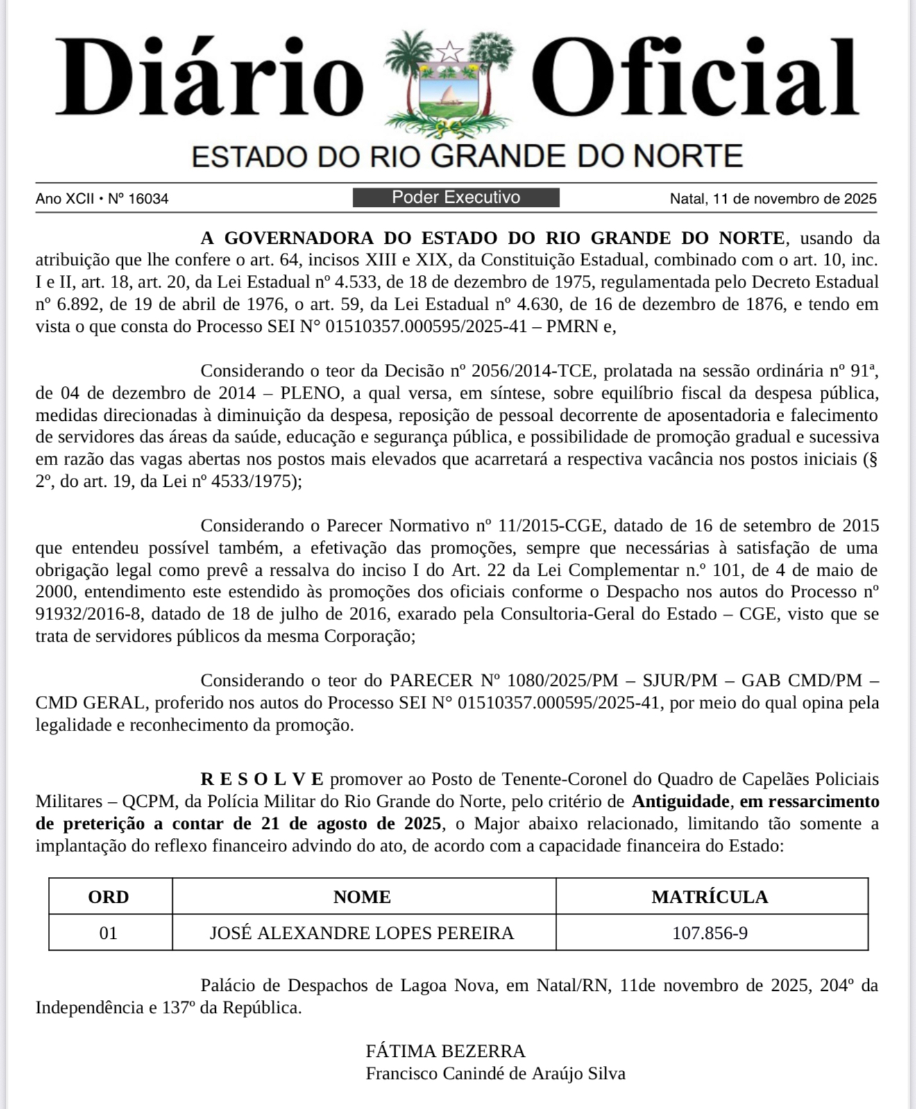 Conhecido carinhosamente como Padre Alexandre, o religioso tem se destacado pelo trabalho pastoral e pelo apoio espiritual aos militares do Seridó. A promoção, segundo o decreto, é por antiguidade, com efeitos retroativos a 21 de agosto de 2025, e reconhece a dedicação e o serviço prestado ao longo de sua carreira como capelão da corporação.