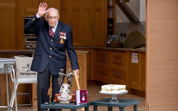 Em abril, isolado em sua casa ao norte da cidade de Londres, o capitão britânico gravou um vídeo em que afirmou que daria 100 voltas em seu próprio quintal, com seu andador, se as pessoas doassem dinheiro para o NHS (sistema de saúde que inspirou o SUS).