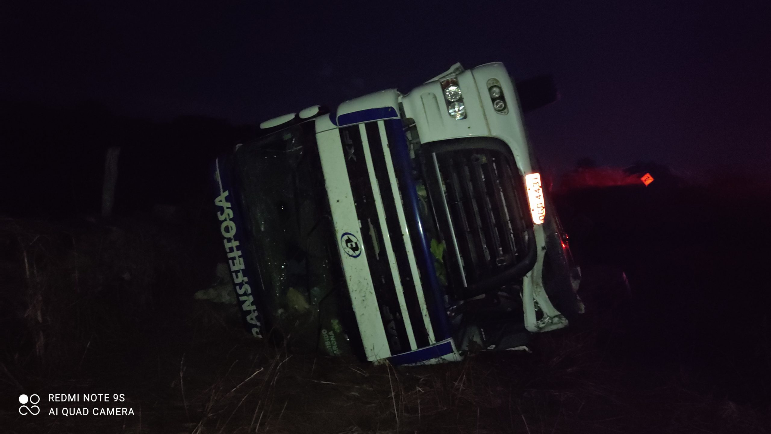 Uma Carreta com carga de cimento tomba na RN-118, próximo a Jucurutu, saída para Caicó, e motorista fica ferido.