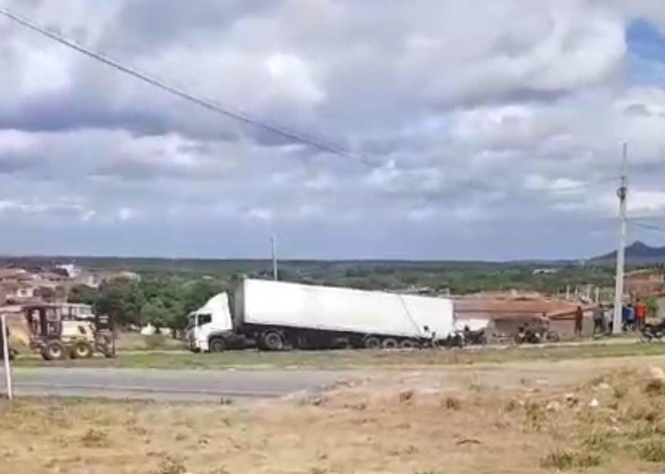 Uma carreta emperrou em um barranco na entrada de Acari nesta sexta-feira (14). Ninguém ficou ferido, mas o veículo está com risco de tombamento.