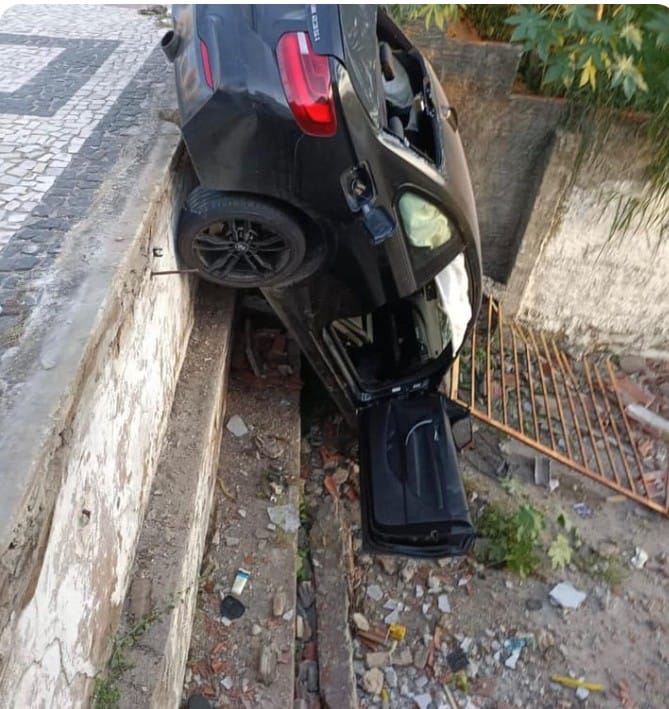 Um carro de luxo da marca BMW saiu da pista e caiu dentro de um terreno após passar direto no calçadão da Avenida Engenheiro Roberto Freire, na Zona Sul de Natal, nesta sexta-feira (21). O acidente aconteceu na altura da rotatória que liga a Rota do Sol.