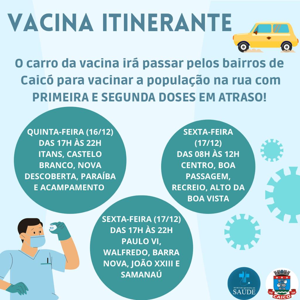 O carro da vacina irá passar pelos bairros para vacinar a população na rua com primeira e segunda doses em atraso.