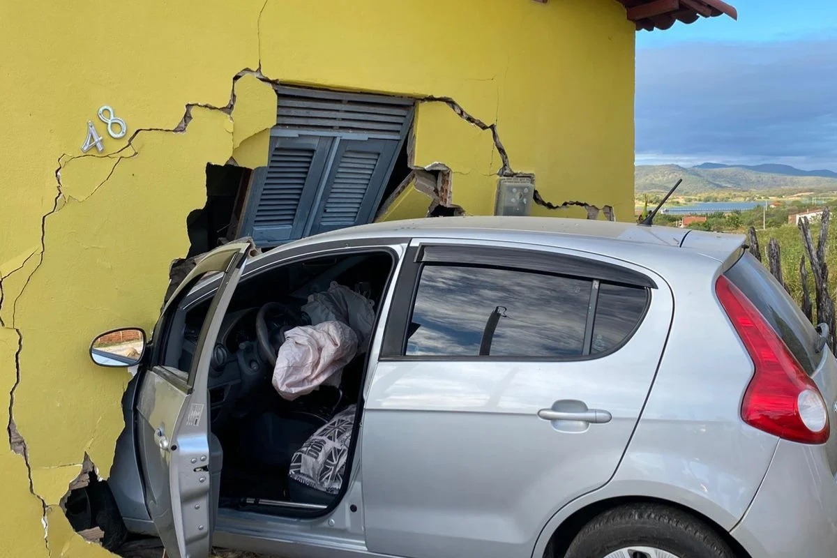 Imagens do local mostram o automóvel cravado na parede frontal da casa. A batida causou danos à estrutura, com rachaduras visíveis e destruição de parte da janela.